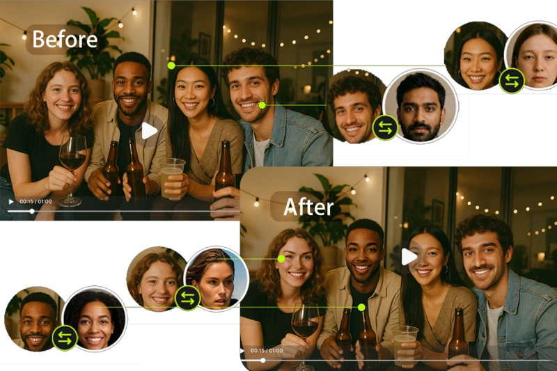 Swap faces of everyone at your birthday, wedding, or vacation video. Make your group memories even funnier and more unforgettable with just one click—perfect for sharing laughs with friends and family.